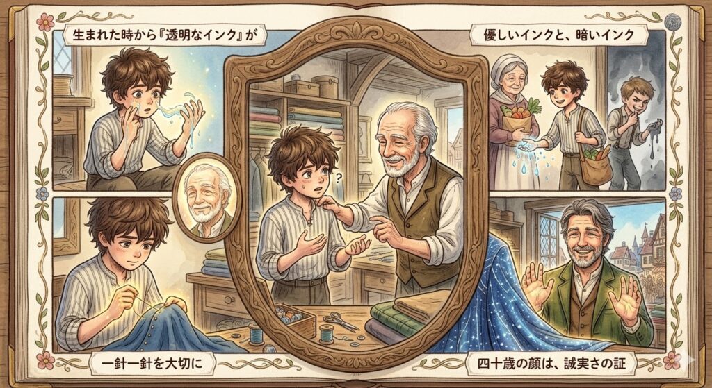 親方はニコの肩を叩きました。 「簡単なことさ。未来の自分に、素敵な服を仕立ててあげるつもりで、今日を過ごすことだ。 小さな努力を積み重ねて、誠実に生きる。その一滴一滴のインクが、四十歳になったニコを、どんな高価な宝石よりも輝かせるんだよ」